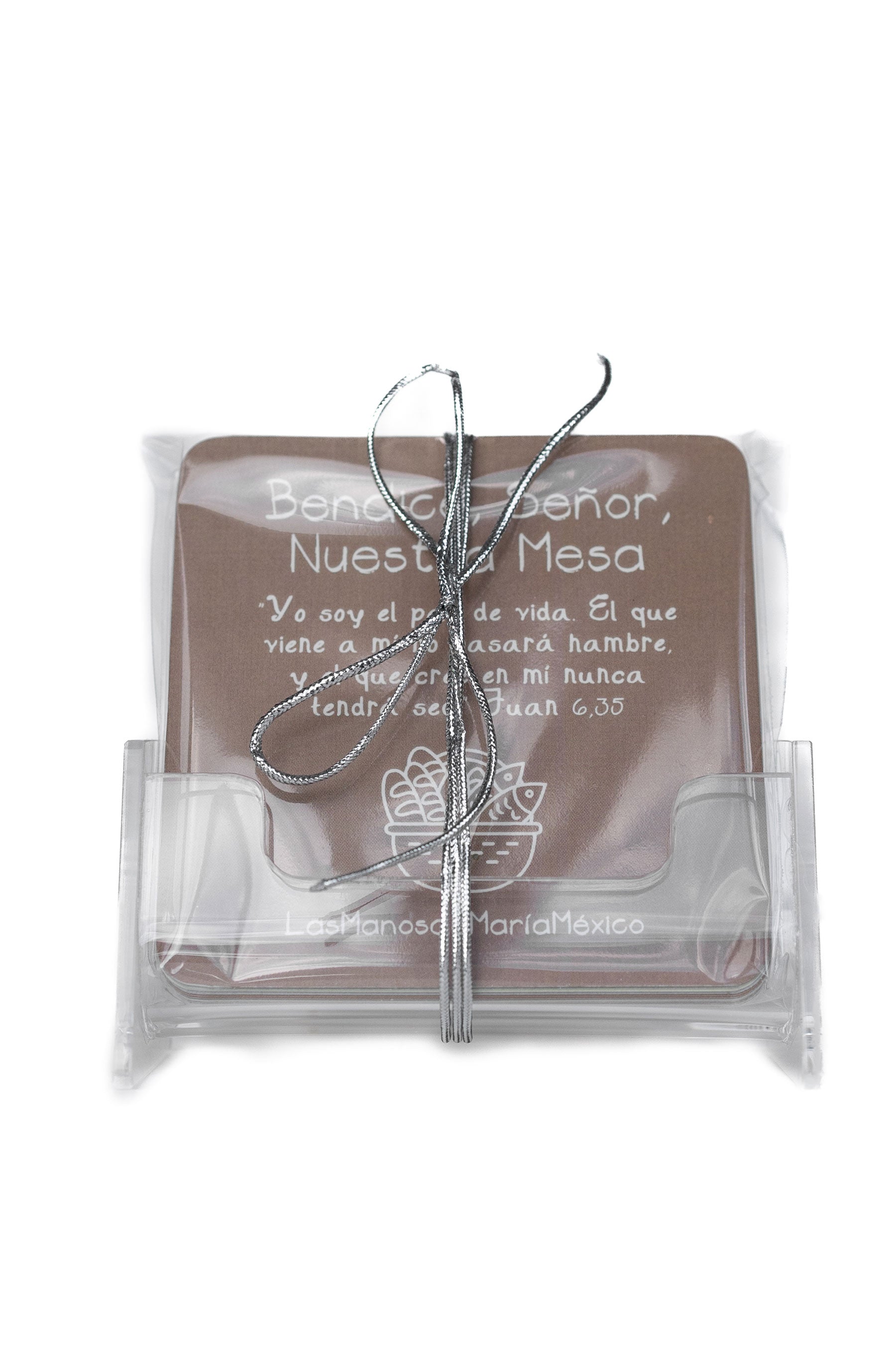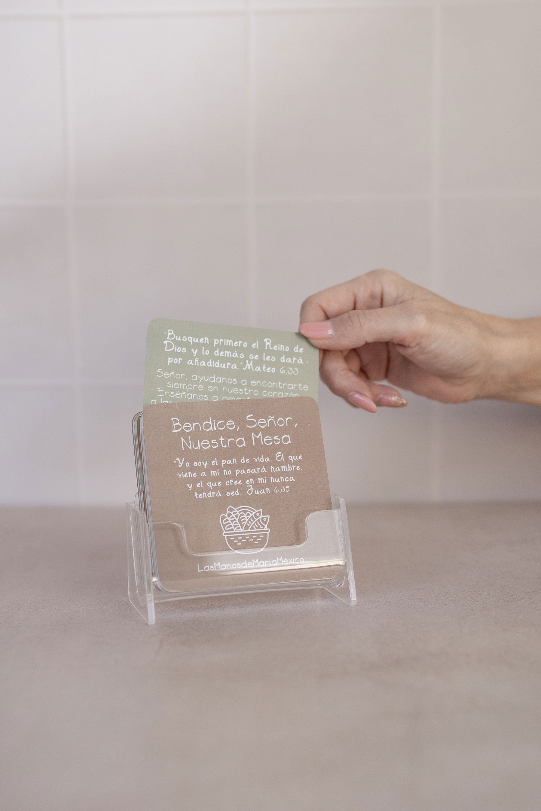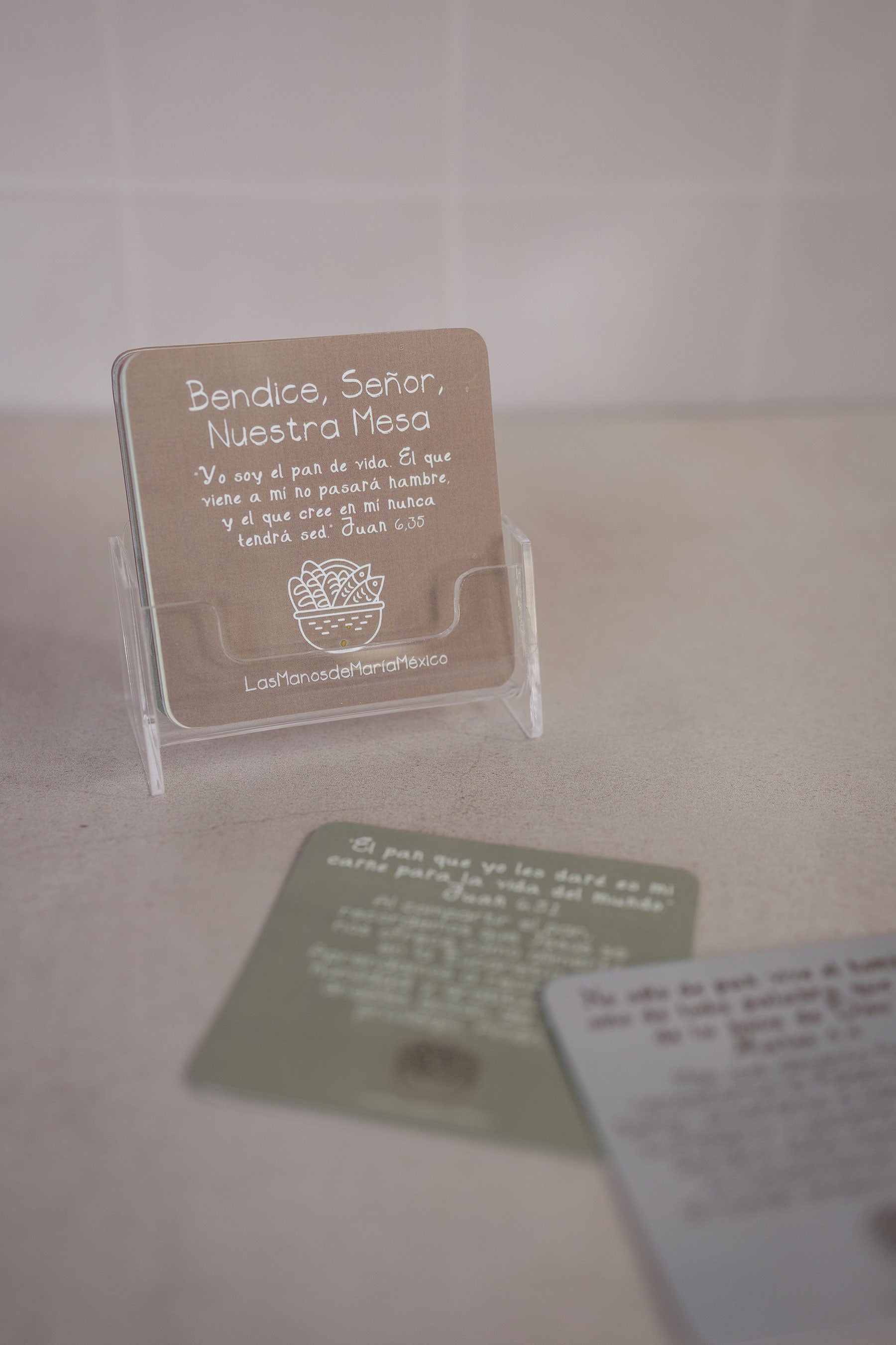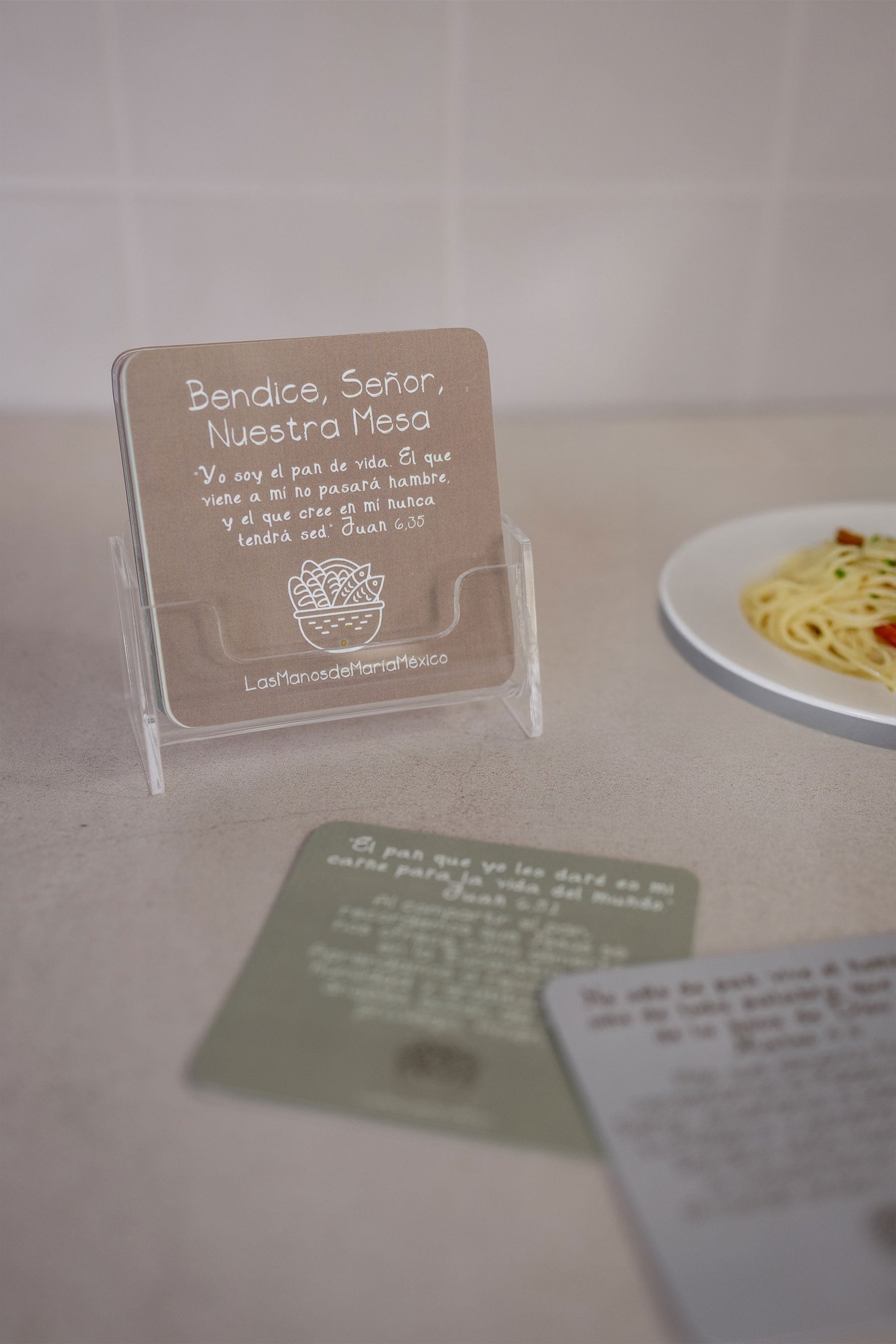 El set incluye oraciones y citas bíblicas para agradecer y compartir en comunidad, acompañadas de un soporte acrílico que permite tenerlas siempre visibles en tu mesa o cocina.